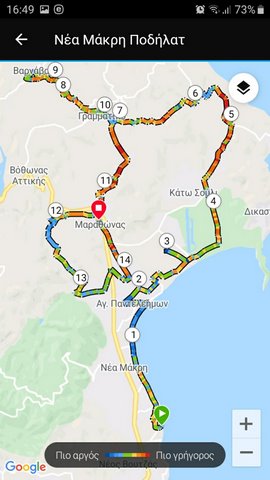 Διαδρομή: Με εκκίνηση στην περιοχή Προβάλυνθος- τη σημερινή Νέα Μάκρη και τα περίχωρα της- και συγκεκριμένα από την εκκλησία του Αγίου Ανδρέα Νέας Μάκρης, κατευθυνόμαστε προς παραλία Μαραθώνα ακολουθώντας τη διαδρομή του παραλιακού μετώπου και περνώντας από το Ιερό των Αιγυπτίων Θεών στην Μπρεξίζα. Στη συνέχεια θα αντικρύσουμε τον Τύμβο Μαραθώνα και θα κατευθυνθούμε προς την περιοχή Τρικόρυνθο και προς το Τρόπαιο της Μάχης του Μαραθώνα. Κατόπιν κατευθυνόμαστε προς περιοχή κάτω Σούλι και περιοχή Λοιμικού στον αρχαιολογικό χώρο του Ραμνούντα. Αμέσως μετά ακολουθούμε τη διαδρομή προς Γραμματικό και Βαρνάβα. Από εκεί επιστρέφουμε προς Μαραθώνα, με κατεύθυνση προς την περιοχή Οινόη Μαραθώνα, Πύργο Οινόης, Σπήλαιο Πανός, κατοικία Ηρώδη Αττικού. Το τελευταίο τμήμα της διαδρομής ακολουθεί την κατεύθυνση προς περιοχή Βρανά- Πρωτοελλαδικό Νεκροταφείο- Τύμβο Πλαταιών Μαραθώνα - Αρχαιολογικό Μουσείο Μαραθώνα περιοχή Τσέπι και ο τερματισμός θα γίνει στο Μουσείο Μαραθωνίου Δρόμου στον Μαραθώνα. Η απόσταση που θα διανύσουμε είναι 73 χλμ.