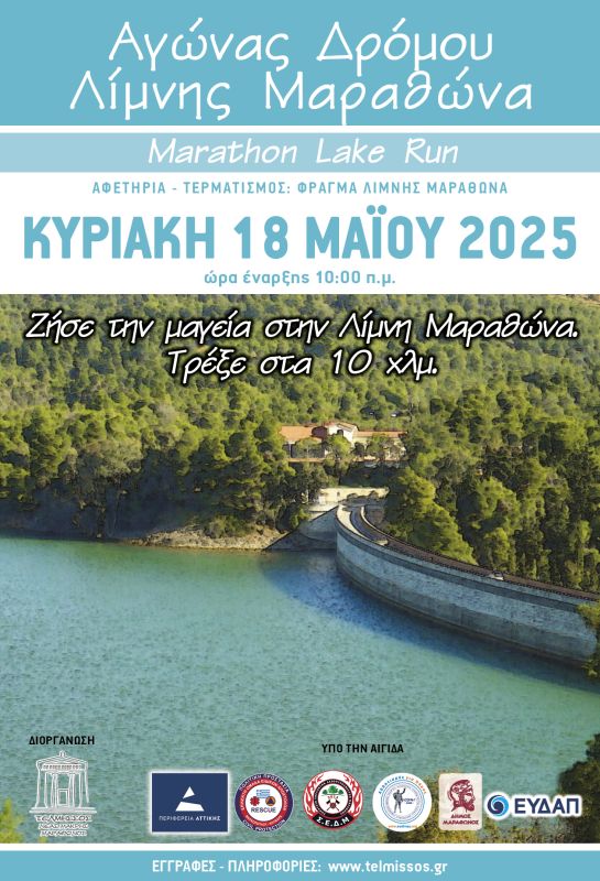 Ο Σύλλογος Μαραθωνοδρόμων ΤΕΛΜΗΣΣΟΣ Ν. Μάκρης - Μαραθώνος προκηρύσσει τον Αγώνα Δρόμου Λίμνης Μαραθώνα- Marathon Lake Run) 10 χλμ, την Κυριακή 18 Μαΐου 2025 και ώρα 10:00 π.μ. με αφετηρία στο πανέμορφο και μοναδικό πέτρινο Φράγμα της Λίμνης Μαραθώνα.