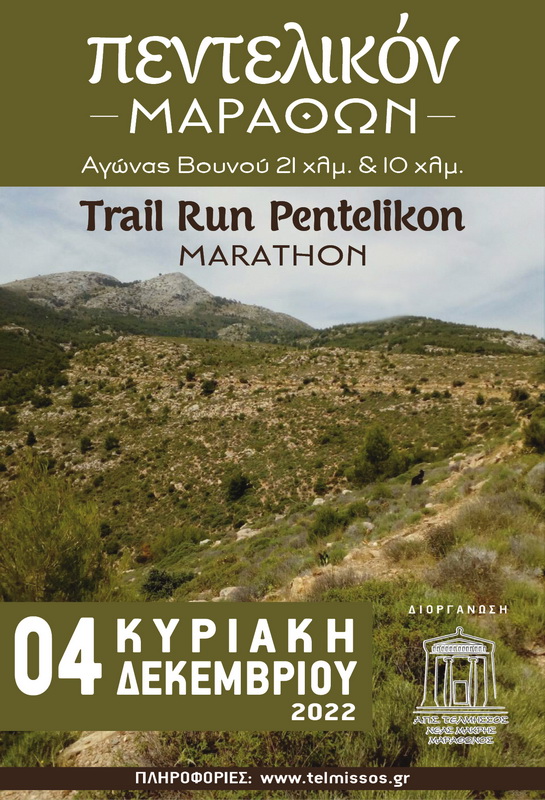 Ο Σύλλογος Μαραθωνοδρόμων ΤΕΛΜΗΣΣΟΣ Ν.Μάκρης - Μαραθώνος σε συνεργασία με το Σωματείο Εθελοντών Δασοπυροσβεστών Μαραθώνα, με την υποστήριξη του Δήμου Μαραθώνα, και υπό την αιγίδα της Περιφέρειας Αττικής καθώς και της ΕΟΣΛΜΑ-Υ, διοργανώνει για πρώτη φορά την αθλητική- πολιτιστική συνάντηση αναψυχής ( Αγώνα Βουνού με την ονομασία Πεντελικόν Μάραθων Pentelikon Marathon Trail Run απόστασης 21 & 10χλμ ) Η ημερομηνία διεξαγωγής έχει προγραμματιστεί να γίνει την Κυριακή 4 Δεκεμβρίου 2022 και ώρα 09:00πμ για τον αγώνα των 21χλμ, και 09:30πμ για τον αγώνα των 10χλμ. Σκοπός μας ειναι η ανάδειξη του φυσικού μας κάλους της ευρύτερης περιοχής, καθώς και η διάσωση των δασών μας. Το Πεντελικόν Όρος εχει απίστευτη ιστορική σημασία καθώς και πανέμορφες δασικές διαδρομές.