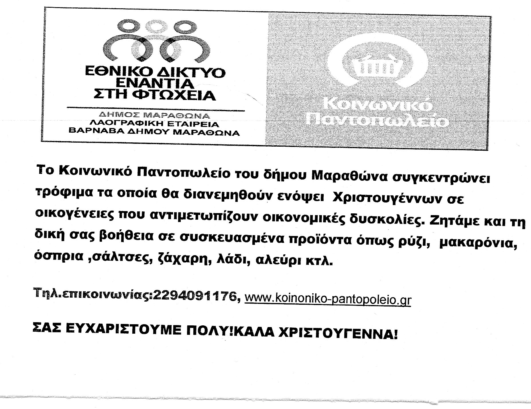 Βοηθήστε τον συνάνθρωπο μας που έχει άμεση ανάγκη προσφέροντας τρόφιμα και είδη ατομικής υγιεινής - απορρυπαντικά. Όλα τα είδη που θα θέλατε να προσφέρετε τα παραλαμβάνουν το προσωπικό της Μονάδας Κοινωνικής Μέριμνας και Βοήθεια στο Σπίτι. Για περισσότερες πληροφορίες απευθυνθείτε στα τηλ 2294069820-67630.