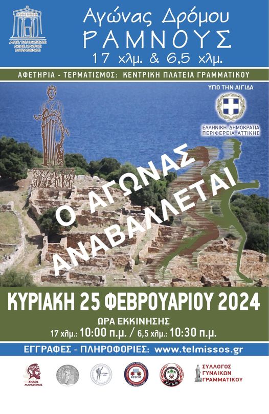 Ο αγαπημένος σε όλους μας Αγώνας Δρόμου Ραμνούς - Γραμματικό που ήταν προγραμματισμένος για τις 25 Φεβρουαρίου 2024, δεν θα πραγματοποιηθεί για το έτος 2024 καθαρά για τεχνικούς λόγους. Σας περιμένουμε φυσικά στον άλλο προγραμματισμένο Αγώνα Δρόμου Λίμνης Μαραθώνα-Marathon Lake Run που θα πραγματοποιηθεί στις 26 Μαΐου 2024. Θα χαρούμε να σας δούμε και να απολαύσετε την όμορφη διαδρομή της Λίμνης του Μαραθώνα.
