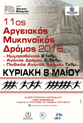 Ο Τελμησσός διοργανώνει αυθημερόν εκδρομή και ομαδική συμμετοχή για τον 11ο Αργειακό Μυκηναϊκό Δρόμο 2016, Ημιμαραθώνιο καθώς και 5,5χλμ , την Κυριακή 8 Μαΐου 2016. Θα αναχωρήσει πούλμαν από το Δημαρχείο Νέας Μάκρης και ώρα 5:45 πρωί. Το κόστος μετάβασης ανέρχεται στα 12 ευρώ αν άτομο. Η συμμετοχή στους αγώνες είναι δωρεάν. Για περισσότερες πληροφορίες και εγγραφές στα τηλ: 22940 98696 και 6944205793 - 22940 96238 Σοφία Αρσενοπουλου.