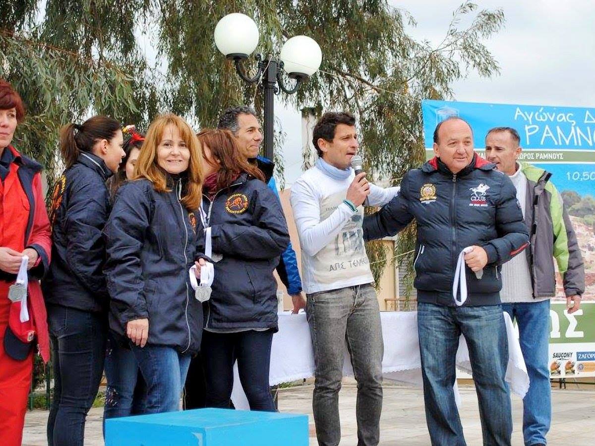 σε όλους τους τερματίσαντες αθλητές.Ιδιαίτερα στις απονομές των τριών πρώτων Νικητών / Νικητριών, δόθηκαν για έπαθλα αγαλματίδια με το σύμβολο του Ραμνούς την θεά Νέμεσις, αλλά και αγαλματίδια φτιαγμένα από τον σύλλογο γυναικών, την θεά Νέμεσις, και τα παραδοσιακά κεντητά ψωμιά (κουλούρες του γάμου η της βάπτισης) που δίνονται στην περιοχή του Γραμματικού. Οι κουλουρες ήταν φτιαγμένες από μια κυρία από το Γραμματικό.Είναι πολύ σημαντικό και σπουδαίο σε αγώνες τέτοιους που έχουν να κάνουν με την Ιστορία αλλά και την τοπική παράδοση, να προβάλλονται παράλληλα ήθη και έθιμα της περιοχής μας. Τέλος εμείς θα θέλαμε να σας ευχαριστήσουμε όλους που μας τιμήσατε με την παρουσία και την συμμετοχή σας στον 1ο Αγώνα Δρόμου Ραμνούς, και θα χαρούμε πολύ να μας τιμήσατε ξανά με την παρουσία σας και στον 2ο Αγώνα Δρόμου Ραμνούς 2016 πάντα την τελευταία Κυριακή των αποκριών!!!