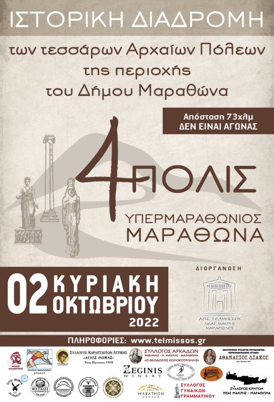 ΤΕΤΡΑΠΟΛΙΣ ΙΣΤΟΡΙΚΗ ΔΙΑΔΡΟΜΗ ΤΩΝ ΤΕΣΣΑΡΩΝ ΑΡΧΑΙΩΝ ΠΟΛΕΩΝ ΤΟΥ ΔΗΜΟΥ ΜΑΡΑΘΩΝΑ. Τρέχουμε για δεύτερη χρονια στην ΤΕΤΡΑΠΟΛΗ, τιμώντας την ιστορία του Δήμου Μαραθώνα. Υπεραπόσταση 73 χλμ Κυριακή 2 Οκτωβρίου 2022 ώρα 6:00 πμ