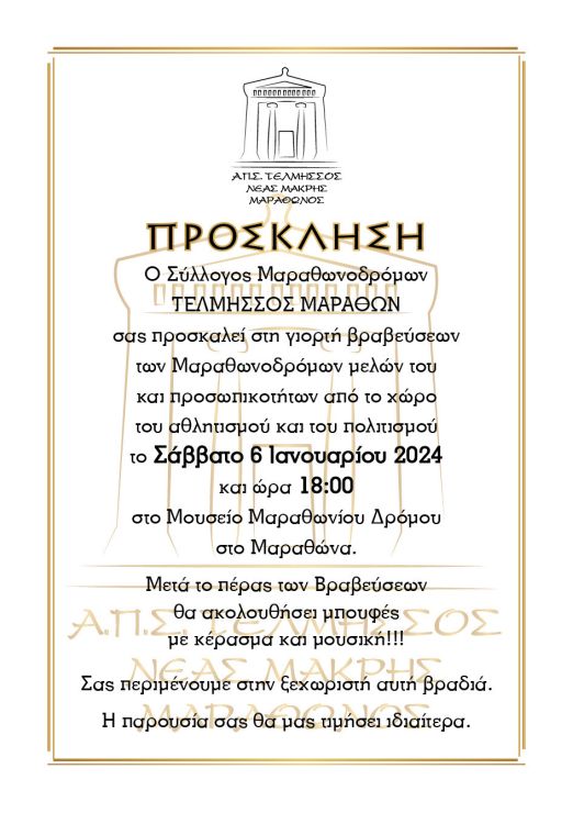 Ο ΤΕΛΜΗΣΣΟΣ ως σύλλογος Μαραθωνοδρόμων του ιστορικού Μαραθώνα υπό την αιγίδα του Δήμου Μαραθώνος και του Μουσείου Μαραθωνίου Δρόμου και με συνεργάτες και υποστηρικτές τους Φίλους του Αρχαιολογικού Μουσείου Μαραθώνα, τα Μαραθώνια Μονοπάτια, τις Πολιτιστικές Απόπειρες, το Σύλλογο Γυναικών Γραμματικού, το Σύλλογο Αρκάδων Νέας Μάκρης Μαραθώνα, το Οινοποιείο Ζεγγίνης, το Ωδείο Μαραθώνα- Δώρα Ρούση και το ταξιδιωτικό γραφείο Timothy’s Family σας παρουσιάζουν το