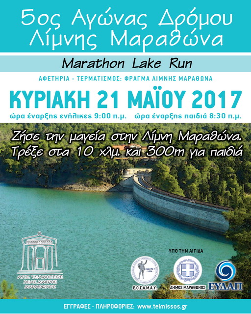Ο Τελμησσός Ν.Μάκρης- Μαραθώνος με την υποστήριξη της ΕΥΔΑΠ καθώς και υπό την αιγίδα του Δήμου Μαραθώνα και της ΕΟΣΛΜΑ-Υ συνδιοργανώνουν τον 5ο Αγώνα Δρόμου απόστασης 10 χλμ και 300μ για παιδιά με αφετηρία και τερματισμό το πανέμορφο και μοναδικό Φράγμα της Λίμνης Μαραθώνα. Ο 5ος Αγώνας Λίμνης Μαραθώνα Marathon Lake Run θα διεξαχθεί την Κυριακή 21 Μαΐου 2017 και ώρα 9:00 πμ.Στον αγώνα θα υπάρχει ηλεκτρονική χρονομέτρηση. Θα δοθεί μετάλλιο και αναμνηστικά σε όλους τους τερματίσαντες, καθώς και στον τερματισμό θα σας περιμένει μπουφές με κάποιο κέρασμα.