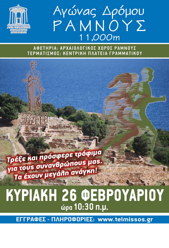 Ο Σύλλογος Μαραθωνοδρόμων ΤΕΛΜΗΣΣΟΣ Ν.ΜΑΚΡΗΣ - ΜΑΡΑΘΩΝΟΣ, με την υποστήριξη του συλλόγου γυναικών Γραμματικού καθώς και του συλλόγου νεολαίας Γραμματικού, και υπό την αιγίδα του Δήμου Μαραθώνα καθώς και της ΕΟΣΛΜΑ-Υ, συνδιοργανώνουν τον αγώνα δρόμου απόστασης 11 χλμ με εκκίνηση έναν από τους σπουδαιότερους αρχαιολογικούς χώρους της Ελλάδας την αρχαία Ραμνούς, και τερματισμό ένα από τα ωραιότερα χωριά τις Αττικής, το Γραμματικό.Ο 3ος Δρόμος Ραμνούς θα διεξαχθεί την Κυριακή 26 Φεβρουαρίου 2017 και ώρα 10.30 πμ. Στον αγώνα θα υπάρχει ηλεκτρονική χρονομέτρηση. Θα δοθεί μετάλλιο και αναμνηστικά σε όλους τους τερματίσαντες,καθώς και στον τερματισμό θα σας περιμένει παραδοσιακό τοπικό κέρασμα.